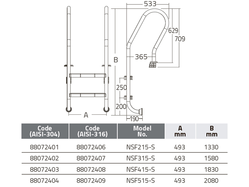 Технические характеристики лестницы Emaux NSF315-S (3 ступени):
