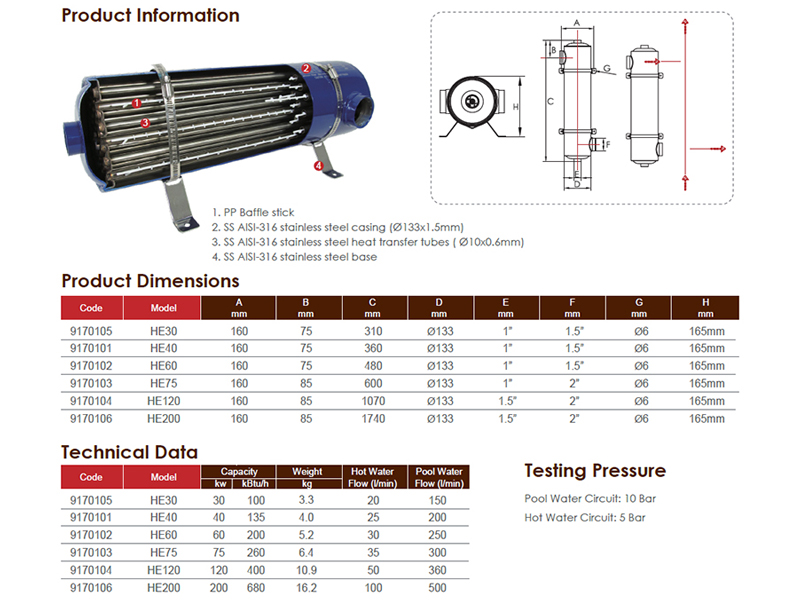 Теплообменник из нержавеющей стали (200 kw) (вертикальный) HE200 Emaux 9170106 - предназначен для нагрева воды от источников тепла (бойлер, тепловая сеть, т.д.), нагретая вода, проходя через теплообменник, передает тепловую энергию в систему бассейна. Изготовлен из нержавеющей кислотостойкой стали марки AISI-316L толщиной 1.5 мм, корпус защищён антикоррозиным покрытием толщиной 0.2 мм. Подходит для любого типа инсталляций (котлы, тепловые насосы, солнечные панели и др.).